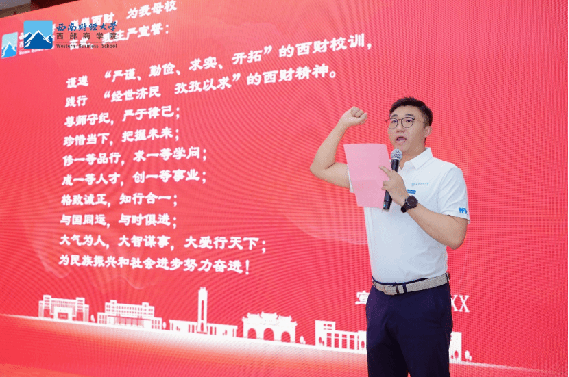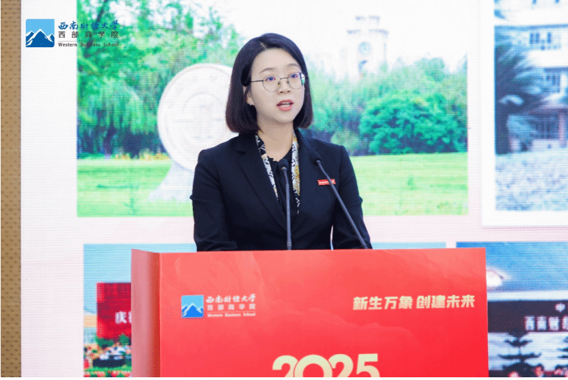 典礼上,齐琳琳以“信之所往,行之所至”为题,代表学院向新生送上祝福并提出殷切希望。她指出,西财百年来始终秉持“兴学报国、敢为人先”“经世济民、孜孜以求”的精神传统,鼓励新生传承这份信念,在变革与挑战并存的时代中坚守初心、砥砺前行。她特别强调“相信”的力量——“相信学习,能破迷茫之局;相信成长,可越现实之坎;相信时代,不负赤子之心;相信彼此,成就不孤之路”,寄语新生在西商的学习生涯中,不仅收获知识与能力,更要涵养格局与情怀,将个人成长与企业、时代发展紧密结合,以实业报国服务民族复兴。