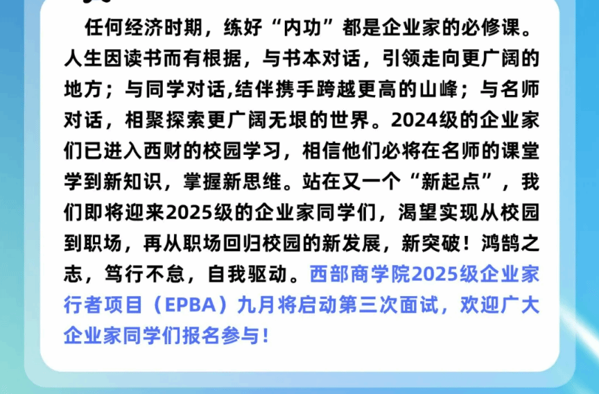 鸿鹄之志·笃行不怠|轻小说 2025级企业家行者项目(EPBA)九月面试通知